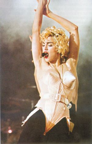 Jean Paul Gaultier在1983年的內(nèi)衣發(fā)布會(huì)上,將“導(dǎo)彈式胸罩”穿在男式條紋套裝外面。但這種內(nèi)衣外穿的概念得以真正流行,應(yīng)歸功于麥當(dāng)娜1990年世界巡演上穿上Gaultier設(shè)計(jì)的金色錐形胸罩,令世界矚目。