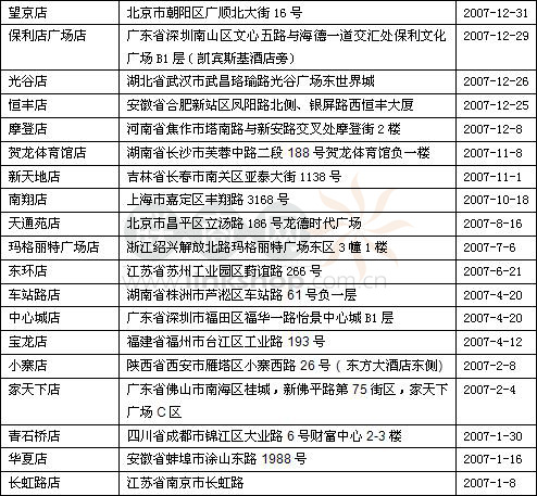 門店數(shù)目:2007年新開門店19 家,截至2007年12月31日