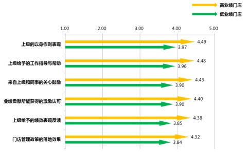 店員和店長提供的數(shù)據(jù)能夠反映出,大家普遍最認可的是一線的管理水平直接影響門店氛圍的好壞,而透過數(shù)據(jù)我們發(fā)現(xiàn)一線管理水平的認可度高低與門店績效表現(xiàn)的差距正相關(guān)。