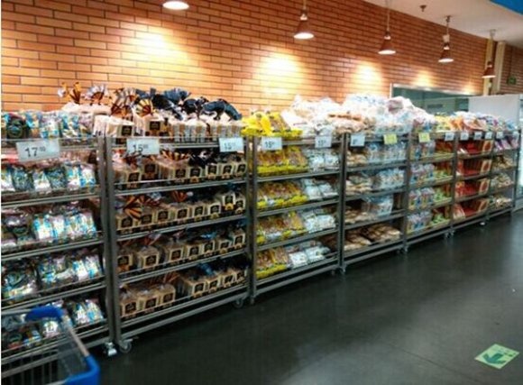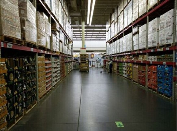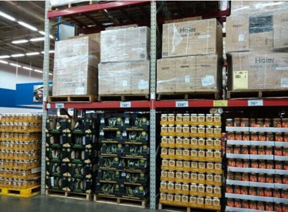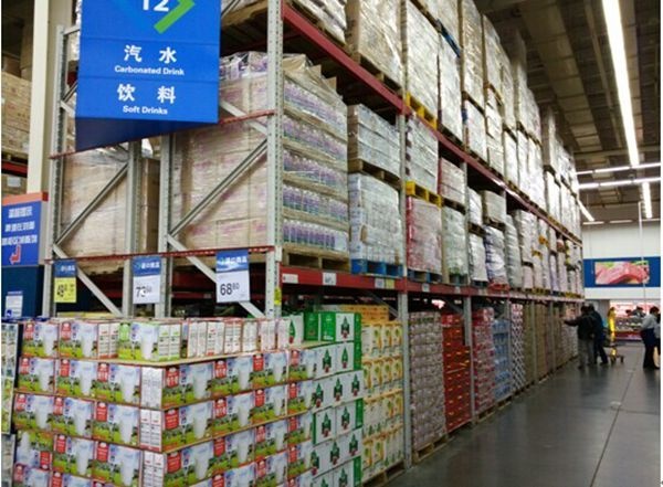 山姆會員店是倉儲式賣場,后倉庫與賣場合二為一,將貨架分為三層,上兩層整齊的擺放復(fù)合包裝還未拆包的商品,最下層擺放的是拆包的獨(dú)立包裝商品。上兩層存貨,下層賣貨,這樣的設(shè)計(jì)看上去既整齊又壓縮了貨物所占的空間,減少庫存,節(jié)省費(fèi)用,更方便售貨員陳列商品,他們只需用叉車將復(fù)合包裝的貨物挑下放在底層地面上,拆除買包裝即可,多數(shù)是機(jī)械化作業(yè),很少人工搬運(yùn)。