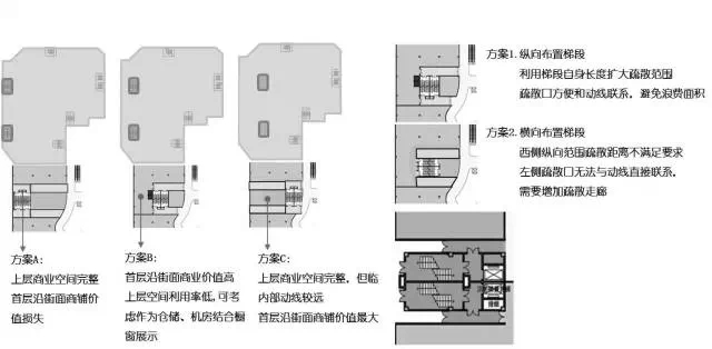 確定商業(yè)動線類型和走向后,要落位動線上的每一點。決定動線落位的因素不是業(yè)態(tài),而是疏散樓梯、衛(wèi)生間、設(shè)備機房及結(jié)構(gòu)柱網(wǎng)。疏散樓梯是解決建筑層面的消防問題,卻是影響商業(yè)價值最大的阻礙。以二層最不利疏散距離為依據(jù),確定合理樓梯數(shù)量后,樓梯排布就是一個要權(quán)衡多方價值的難點。假如從臨街面到主動線有三跨柱網(wǎng),那樓梯究竟要布置在靠近哪一跨成為可探討/比較的話題,另外樓梯是垂直動線布置還是平行動線布置則是另一個話題,沒有正確答案,每一個項目的情況不一樣(圖2)。