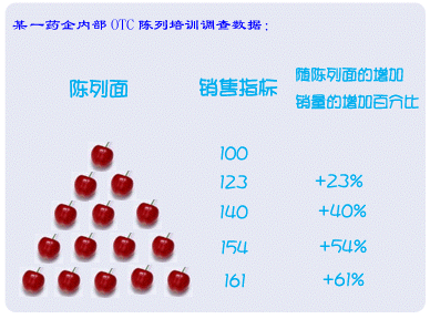 陳列面:陳列面是指面向消費者的藥品的單側(cè)外包裝面,銷售額可隨著陳列面的增大而增加這是個不爭的事實,在諸多的調(diào)查中,有這樣一個數(shù)據(jù)可以形象的顯示增加陳列面可以提高藥品銷量(如下圖):