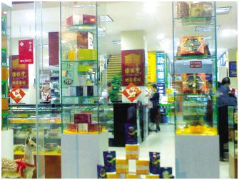 筆者曾在上海雷允上連鎖藥店的一家門店看到,其店招的色彩和設(shè)計(jì)與其櫥窗廣告渾然一體,所宣傳的品種畫(huà)面協(xié)調(diào)統(tǒng)一,產(chǎn)品噴繪質(zhì)量較高,畫(huà)面意境富有美感(圖4)。而云南昆明福林堂位于步行街的旗艦店櫥窗廣告亦堪稱佳作(圖5),努力追求動(dòng)感和藝術(shù)美,以新奇的設(shè)計(jì)吸引顧客,準(zhǔn)確一些,應(yīng)稱之為“櫥窗陳列”。櫥窗陳列不是簡(jiǎn)單的產(chǎn)品陳列,更多地追求讓產(chǎn)品像藝術(shù)品一樣展示出來(lái),產(chǎn)品要求少而精、清新悅目,尤其適合于高檔參茸、特色產(chǎn)品和精品展示。櫥窗中有梅花鹿的模型陳列,能夠展現(xiàn)藥店的形象和美譽(yù)度。櫥窗陳列中的產(chǎn)品和裝飾品排列宜疏不宜密,突出反映藥店及其經(jīng)營(yíng)產(chǎn)品的特色,使顧客過(guò)目不忘。如果能讓顧客透過(guò)櫥窗陳列看到店內(nèi)的全景,就能激發(fā)顧客進(jìn)店的欲望,達(dá)到吸引消費(fèi)者的目的。櫥窗陳列可以設(shè)計(jì)主題,并隨季節(jié)和時(shí)間進(jìn)行更換。