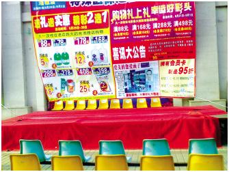 在店門外發(fā)布各種促銷活動(dòng)的信息也是門店設(shè)計(jì)的一部分(圖7),包括門店產(chǎn)品買贈(zèng)信息、產(chǎn)品促銷優(yōu)惠信息、會(huì)員優(yōu)惠政策等等;而大型商超的路演活動(dòng)也慢慢地在一些大型藥店中興起(圖8),通過(guò)一系列主題活動(dòng),以及優(yōu)惠項(xiàng)目激發(fā)消費(fèi)者的參與熱情,吸引顧客的眼球。路演有利于營(yíng)造藥店的銷售火熱場(chǎng)面,塑造門店的旺銷形象。路演以及配合路演設(shè)計(jì)的宣傳展臺(tái)、促銷信息發(fā)布和活動(dòng)內(nèi)容同樣要遵循藥店內(nèi)外的表里如一原則。