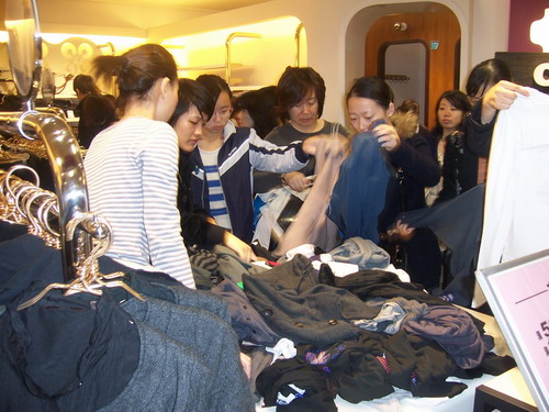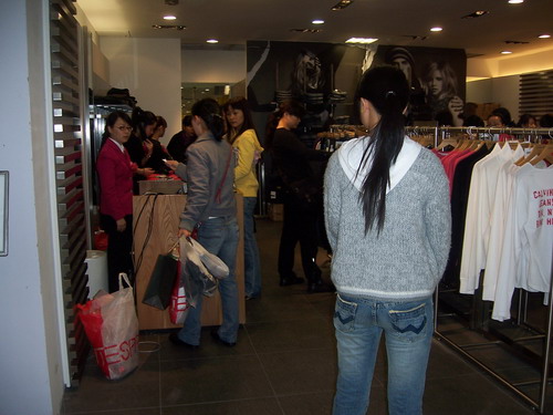 9:45分的時(shí)候,銀泰門口逐漸開始擁擠起來(lái),工作人員緊急疏導(dǎo)。CK JEANS、OCHIRLY、ESPRIT、MY TENO、MOJO、IVYKKI、BEANPOLO、萬(wàn)寶路、LEE、LEVI'S、G-STAR等知名品牌參加活動(dòng),是吸引顧客的一大賣點(diǎn)。記者發(fā)現(xiàn),NIKE、ADIDAS、KAPPA滿600減200,活動(dòng)力度不大,但是現(xiàn)場(chǎng)還是人滿為患。