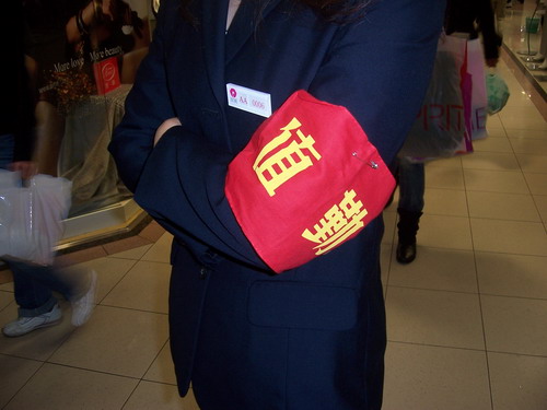 每年店慶,銀泰都有外派警衛(wèi)支援,今年數(shù)量增加。另外商場(chǎng)工作人員增加紅袖標(biāo)識(shí),更方便顧客辨識(shí)。