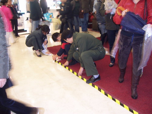 “一早去銀泰,結(jié)果門還沒(méi)開,等開門后,根本就擠不進(jìn)去,等第一波人潮過(guò)去,門口留下了6只不一樣的鞋子,3把踩破的雨傘……”這是8周年店慶的時(shí)候,杭州網(wǎng)友對(duì)血拚現(xiàn)場(chǎng)的文字記錄。顯然,今年的狀況與“血拚”二字相去甚遠(yuǎn)。根據(jù)銀泰方面的消息,開門時(shí)間提前,開門時(shí)間隱秘,也是為顧客的安全考慮更多。另外,記者發(fā)現(xiàn),在每一層樓的電梯口都有醫(yī)務(wù)室地點(diǎn)和安全購(gòu)物的標(biāo)示牌。另?yè)?jù)工作人員介紹,為了給顧客更大的購(gòu)物空間,今年,商場(chǎng)還為一些知名品牌設(shè)立了專門的提貨處。