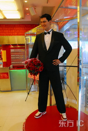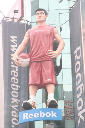 姚明贊助商某體育品牌為其打造的巨型雕像日前在北京王府井利生商場落成。王府井利生商場是一家專門經(jīng)營體育用品的商場,而姚明的雕像,就被掛在了商場的側面。姚明的雕像高12米,通身由玻璃鋼制成。身穿紅色戰(zhàn)袍,手持籃球,腳踏特別定制的2008限量版戰(zhàn)靴,昂首挺胸,直視前方,臉上帶著柔和而堅定的笑容,并且雕像走Q版風格,非?蓯,使所有看到的人都會忍不住發(fā)笑。