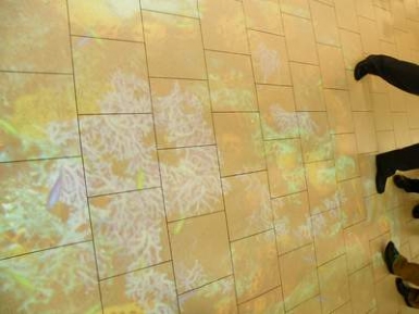 在魚類柜臺(tái)前,空中懸吊的投影儀在地面上投下了這樣的一幅場(chǎng)景:在熱帶海洋的珊瑚從中游來(lái)游去的魚兒。讓人感到新鮮的是,如果你走到投影里面,走到魚的身邊,魚兒會(huì)迅速地逃離你的大腳。