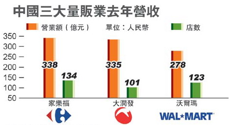 去年家樂福營收較前年成長14.1%,大潤發(fā)與沃爾瑪成長幅度都超過三成,三個(gè)量販業(yè)者的店數(shù)增幅約在20%左右。