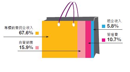 收益以專柜銷售傭金之收入為主,占總收益的67.6%,自營(yíng)銷售和管理費(fèi)收入分別占總收益的15.9%和10.7%,租金收入則占總收益的5.8%。