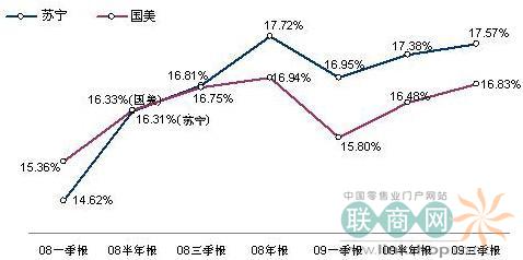 國美三季度綜合毛利率17.48%,較09年二季度環(huán)比上升0.38個百分點,蘇寧三季度綜合毛利率15.86%,較09年二季度環(huán)比上升0.18個百分點。