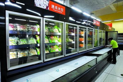昨日,沃爾瑪江北新店,冷凍冷藏區(qū)采用“家用式冰箱”儲(chǔ)存 記者 歐陽(yáng)祖兵 攝