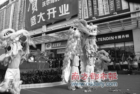沃爾瑪惠東店開業(yè)慶典上,舞獅人舉起獅頭,露出面目。沃爾瑪進(jìn)駐惠東,對于本地商家是狼來了嗎?