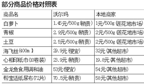 “沃爾瑪確實有特價,但一個系列的10多種商品,往往只有少數(shù)幾種拿來做特價。”“沃爾瑪?shù)馁徫锃h(huán)境確實在惠東算很好。但價格也是我們重要的考量因素。”昨日,消費者、惠東縣大嶺中學(xué)的年輕老師小鄒介紹,僅僅就農(nóng)副產(chǎn)品而言,沃爾瑪與其附近的蓮花地市場相比,價格會高出很多。
