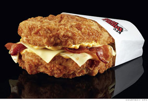 肯德基(KFC)雙層炸雞漢堡(Double Down) 在全美推出后僅兩天,就成為媒體關(guān)注的焦點。它看起來有點像是三明治,只不過上下兩層不是用面包,而是兩片炸過或烤過的雞肉,中間夾著熏肉、蠟質(zhì)奶酪以及上校漢堡醬。雞肉的味道和肉質(zhì)令人想起“福來雞”(Chick-fil-A)的烤雞,吃后可謂滿口留咸。雙層炸雞漢堡外形粗糙、色澤鮮亮,就像芝麻街(Sesame Street,美國著名的幼兒教育電視節(jié)目——譯注)里的塑料玩具?瓷先ニ坪踉跊_你笑,就好像它自己也覺得自己是個笑話。