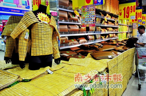 夏天購(gòu)清涼 人人樂(lè)擺出涼席“兵馬俑” 來(lái)源: 聯(lián)商網(wǎng) 2010-05-20 16:12 5月18日,人人樂(lè)超市將麻將席裹在模特身上,促銷(xiāo)有創(chuàng)意。 。戏蕉际袌(bào))