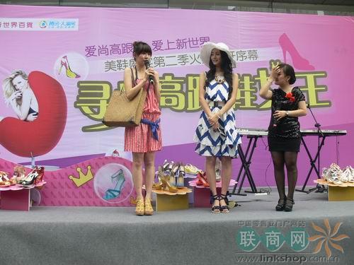 7月10日重慶新世界百貨第一場(chǎng)《尋找高跟鞋女王》選拔賽順利開展,本期來到現(xiàn)場(chǎng)的第一位選手是以網(wǎng)絡(luò)2212票支持率當(dāng)選本周狀元來自時(shí)尚品牌陳列師“陳薇”,第二位選手則是以網(wǎng)絡(luò)2117票支持率名列本周榜眼的外企行政助理“小鷗”。活動(dòng)通過4個(gè)環(huán)節(jié)為大家全面展示選手魅力。1分鐘show time亮相展示了選手的高跟鞋美女風(fēng)范;而細(xì)數(shù)高跟鞋故事環(huán)節(jié)則講述了選手和高跟鞋之間的心情故事;美鞋搭配秀環(huán)節(jié)則重點(diǎn)展示選手駕馭不同風(fēng)格高跟鞋的能力;最后的DIY改造現(xiàn)場(chǎng)教導(dǎo)來賓如何利用有限的鞋子創(chuàng)造出無限搭配可能。