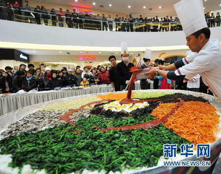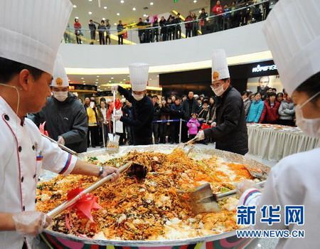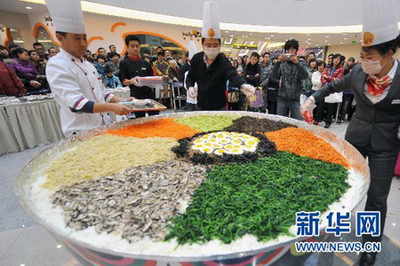 巨型韓國石鍋拌飯亮相長春萬達廣場 來源: 聯(lián)商網(wǎng) 2010-11-14 09:14 當(dāng)日,一道直徑2米的韓式料理石鍋拌飯現(xiàn)身長春市萬達購物廣場,吸引了商場內(nèi)數(shù)百名購物者駐足觀賞和品嘗。據(jù)介紹,這道石鍋拌飯的原料包括150斤大米和50斤胡蘿卜、西葫蘆等蔬菜,耗時近一天烹制而成。 。ㄐ氯A社記者林宏攝)