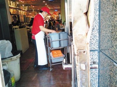 “好食代”緊鄰“金大生”。昨日中午,“好時(shí)代”廚房后門仍然敞開,門鎖位置變形。