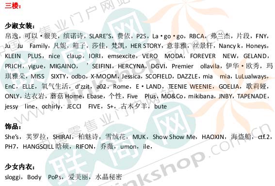 以下為銀泰西湖店負一樓至五樓服飾品牌列表: