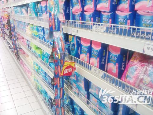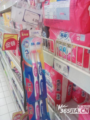 合肥樂購超市促銷 牙刷夾在衛(wèi)生巾貨架上