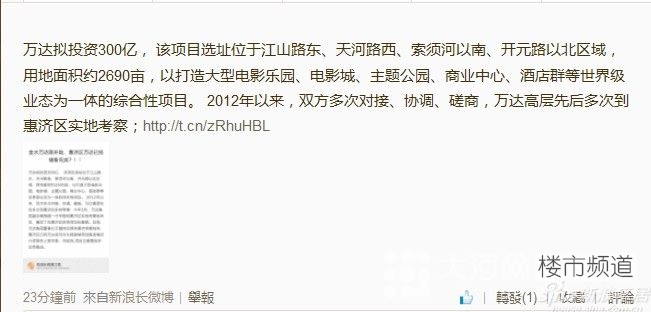 網(wǎng)友“齊林逛地產(chǎn)”微博爆料萬(wàn)達(dá)惠濟(jì)區(qū)拿地