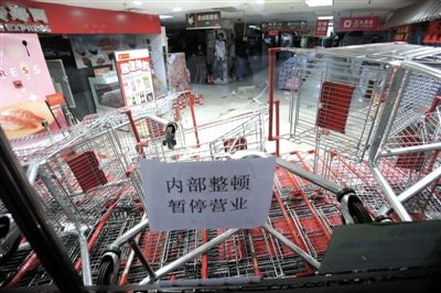 昨日,記者在卜峰蓮花五道口店看到,大門被鎖,購物手推車擋在了門后。門上貼了停業(yè)告示。