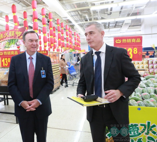 (沃爾瑪全球總裁兼首席執(zhí)行官麥道克(左)訪華期間與沃爾瑪中國總裁兼首席執(zhí)行官高福瀾(右)巡店)