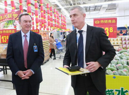 。沃爾瑪全球CEO麥道克和中國CEO高福瀾考察大賣場深入了解市場)