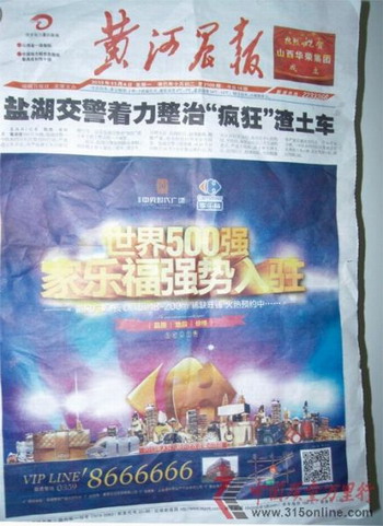 “世界500強(qiáng)家樂福強(qiáng)勢入駐……核心商圈……稀缺旺鋪火熱預(yù)約中……”這是山西運城一家房地產(chǎn)開發(fā)公司在當(dāng)?shù)卮笏脸醋鞯男麄鲀?nèi)容,在一家當(dāng)?shù)孛襟w上,“世界500強(qiáng)家樂福強(qiáng)勢入駐”的廣告更是醒目地刊登在頭版的近乎整版。