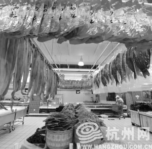 。ㄈA潤(rùn)萬家轉(zhuǎn)塘店生鮮區(qū)咸魚、香腸掛著賣)