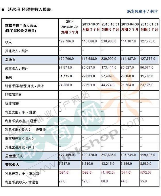 在截至于2014年1月31日的前3個(gè)月里,沃爾瑪總收益達(dá)1297.06億美元,毛利317.35億美元;總運(yùn)營(yíng)開支1223.59億美元,運(yùn)營(yíng)收入為73.47億美元;集團(tuán)稅后凈收益達(dá)45.44億美元。