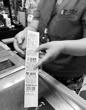 站在新街口物美大賣場結(jié)賬口,買了不少洗滌用品的劉秀桐看著手上的購物小票,有些困惑。往日只記錄購物明細(xì)的小票多出來一截,“憑此券購買海飛絲、潘婷、飄柔、汰漬、碧浪、佳潔士產(chǎn)品滿100元立減20元”。扭身看看買了水果和飲料的朋友,她手上的小票多出來的內(nèi)容卻是關(guān)于寧夏枸杞和枸杞酒的促銷信息。