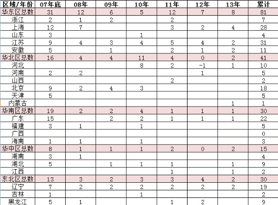 由上表,我們再來看家樂福門店網(wǎng)點布局的特點。在2007年底以前,家樂;臼且缓诵乃闹攸c,華東區(qū)域(31家)是核心,門店數(shù)占了30%,而華南區(qū)(19家)、華北區(qū)(16家)、東北區(qū)(13家)、西南區(qū)(13家)這四個重點區(qū)域則比較均衡,都在13-19家之間。