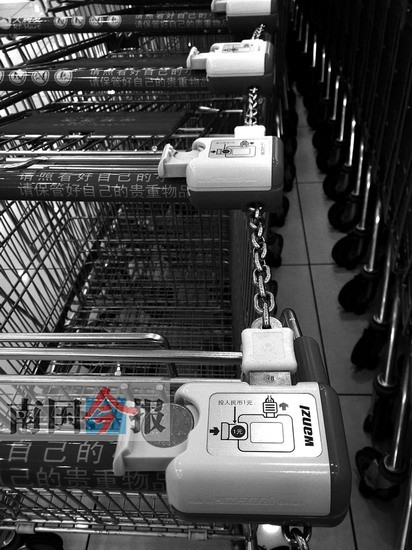 據(jù)超市工作人員介紹,超市從今年6月起實(shí)行新的購(gòu)物車(chē)管理制度:取車(chē)時(shí),首先將一元硬幣放入投幣卡槽中,然后推進(jìn)車(chē)鎖,前一輛購(gòu)物車(chē)的鎖鏈就會(huì)脫出,即可以取車(chē);還車(chē)時(shí),在購(gòu)物車(chē)的鎖孔內(nèi)插入前面那輛購(gòu)物車(chē)的鎖鏈扣,硬幣盒就會(huì)彈出,取回一元硬幣即可。一取一還,錢(qián)還是在顧客手中,超市并沒(méi)有收取任何的購(gòu)物車(chē)使用費(fèi),只不過(guò)這樣一來(lái),顧客要想取回硬幣,就必須把車(chē)歸還到指定地點(diǎn),減少了亂停放的現(xiàn)象,便于超市的管理。