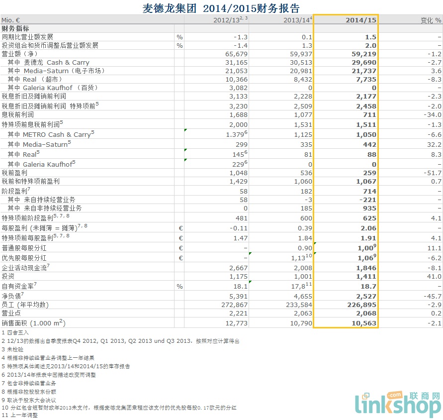 聯(lián)商網(wǎng)消息:德國(guó)麥德龍集團(tuán)發(fā)布2014/2015財(cái)務(wù)報(bào)告,報(bào)告顯示,2014/15年度麥德龍集團(tuán)的營(yíng)業(yè)額和息稅前利潤(rùn)與上一年度同期相比均有小幅度下滑,凈營(yíng)業(yè)額從599.37億歐元降到592.19億歐元,息稅前利潤(rùn)從10.77億歐元下降到7.11億歐元。