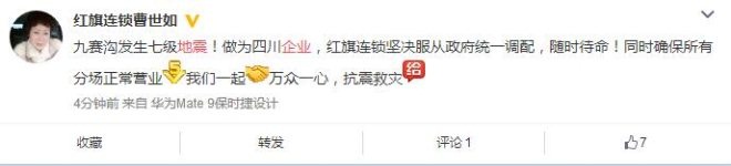 作為四川本土企業(yè),紅旗連鎖掌門人曹世如今日更新微博稱,“九寨溝發(fā)生七級地震!做為四川企業(yè),紅旗連鎖堅決服從政府統(tǒng)一調(diào)配,隨時待命!同時確保所有分場正常營業(yè),我們一起萬眾一心,抗震救災(zāi)!”