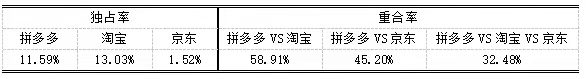 圖1:主流電商平臺用戶重合率和獨占率 數(shù)據(jù)來源:東吳證券、36氪整理