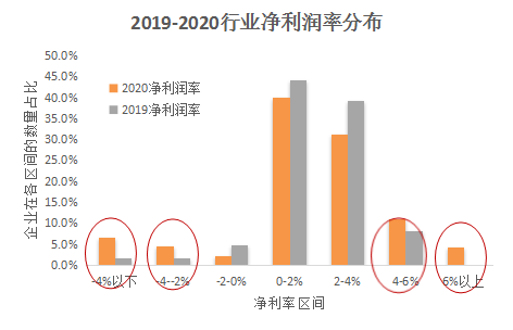 樣本超市整體毛利率提升,由2019年的17.9%提升1.1個(gè)百分點(diǎn),達(dá)19.0%。因防疫防護(hù)、人員加班補(bǔ)貼等剛性支出,凈利潤(rùn)率有所下降,從1.2%下降到1.1%。對(duì)比2019年企業(yè)毛利率和凈利率分布,兩者分化都有所加大。西部企業(yè)、銷售小于10億的企業(yè)平均凈利潤(rùn)率下降較為顯著。