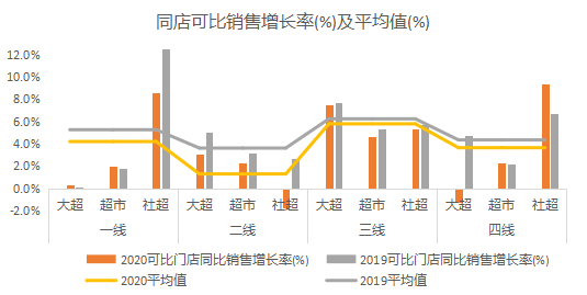 2020年,超市企業(yè)同店可比銷售增長(zhǎng)整體放緩,平均增長(zhǎng)率為4.1%,增長(zhǎng)主要來源于三線城市。大型超市和超市同店可比銷售在三線城市表現(xiàn)最好,社區(qū)超市在四線城市表現(xiàn)最好。從細(xì)分業(yè)態(tài)維度看,大超和社區(qū)超市增長(zhǎng)較快,超市增長(zhǎng)最慢。