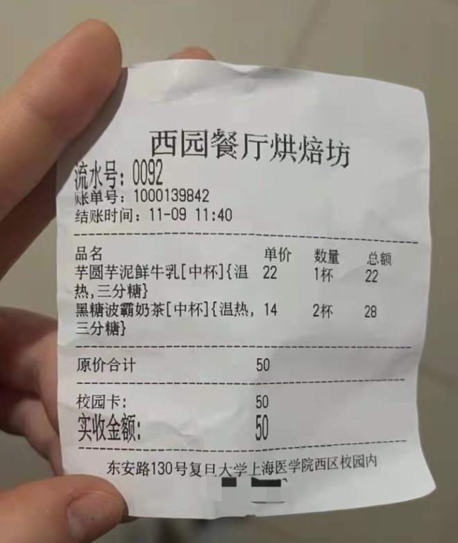 一位復(fù)旦大學(xué)醫(yī)學(xué)院學(xué)生向時代周報記者展示,這款奶茶包裝杯套上印有“內(nèi)服良藥”“一次__杯、一日__次”處方等字樣,吸管上還有復(fù)旦大學(xué)上海醫(yī)學(xué)院相關(guān)路牌。與此同時,這也并非復(fù)旦大學(xué)上海醫(yī)學(xué)院自制,而是復(fù)旦大學(xué)楓林校區(qū)二樓食堂一家茶飲店制作。