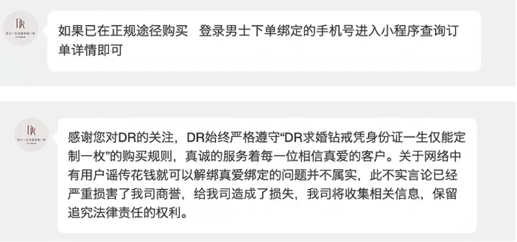 甚至還有網(wǎng)友爆料稱,DR鉆戒宣稱“男士一生僅能定制一枚”,其實(shí)花500元就可以消除購買記錄,但客服稱這并不屬實(shí)。