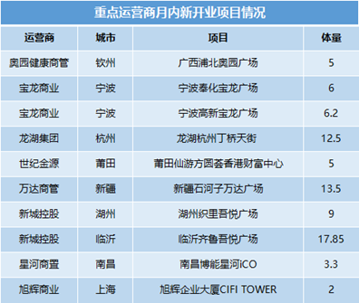 而觀點指數(shù)監(jiān)測下的國內(nèi)重點運營商,如寶龍商業(yè)、新城控股、萬達商管等保持較快擴張速度,月內(nèi)均有新項目開出。