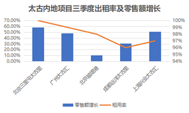 太古地產(chǎn)目前在運營項目在三季度均錄得了不錯的出租率及零售額增長。其中,北京三里屯太古里出租率實現(xiàn)滿租,零售額增長也超50%。