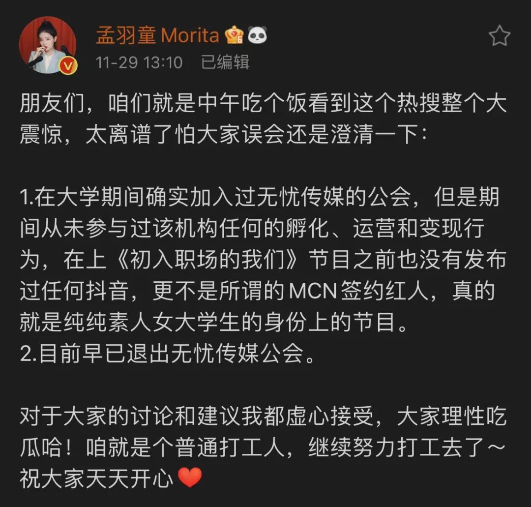 孟羽童很快在微博上作出了回應(yīng):“從未參與過該機(jī)構(gòu)任何的孵化、運(yùn)營和變現(xiàn)行為,更不是所謂的MCN簽約紅人,真的就是純純素人女大學(xué)生的身份上的節(jié)目!