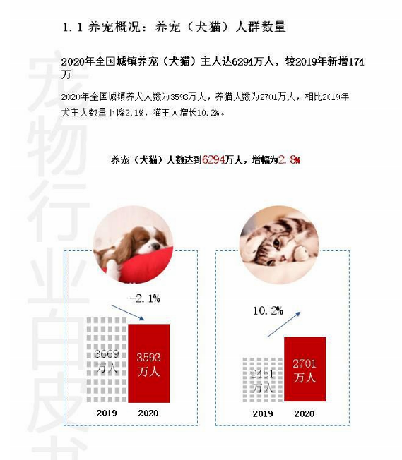《2020年中國寵物行業(yè)白皮書》顯示,2020年全國城鎮(zhèn)養(yǎng)寵(犬貓)人群數量達6294萬+人,較2019年新增174萬;