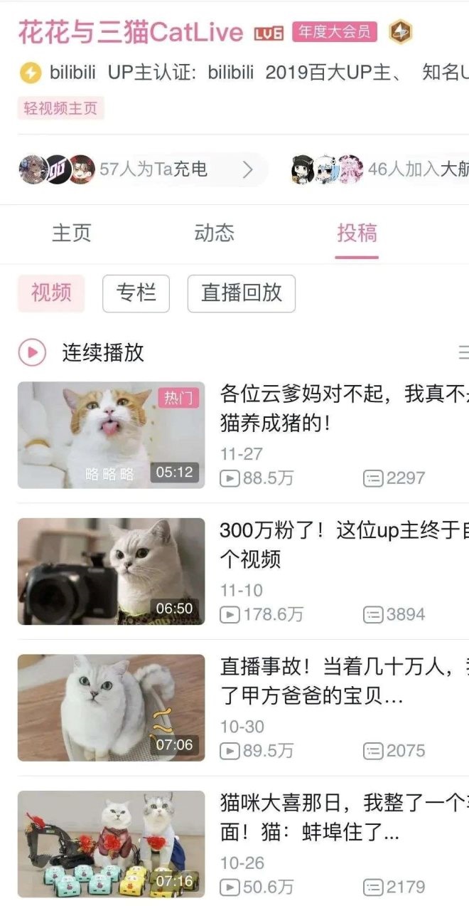 紅碗社記者搜索發(fā)現,在抖音平臺,帶有“貓”標簽的短視頻累計播放量為1076.2億次,其中大量播放量在百萬的視頻,由萌寵博主發(fā)布,如名為“喬巴日記”的短視頻博主,共創(chuàng)作156個與貓相關短視頻,視頻內容主要圍繞7只寵物貓生活,配合后期技術,打造有趣的擬人化劇情,其粉絲量為591.5萬余人;B站知名寵物區(qū)UP主“花花與三貓”,通過記錄5只“性格迥異”貓的生活日常,受到粉絲喜愛,擁有336.2萬粉絲。