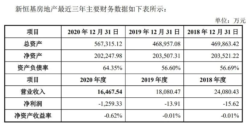 另一邊,主營(yíng)房地產(chǎn)開(kāi)發(fā)業(yè)務(wù)的新恒基地產(chǎn),其業(yè)績(jī)也難言樂(lè)觀,營(yíng)收逐年下降,在2018-2020年分別為2.41億元、1.81億元、1.65億元。同期,凈利潤(rùn)也出現(xiàn)連續(xù)三年虧損,分別為-15.62萬(wàn)元、-13.91萬(wàn)元、-1259.33萬(wàn)元。