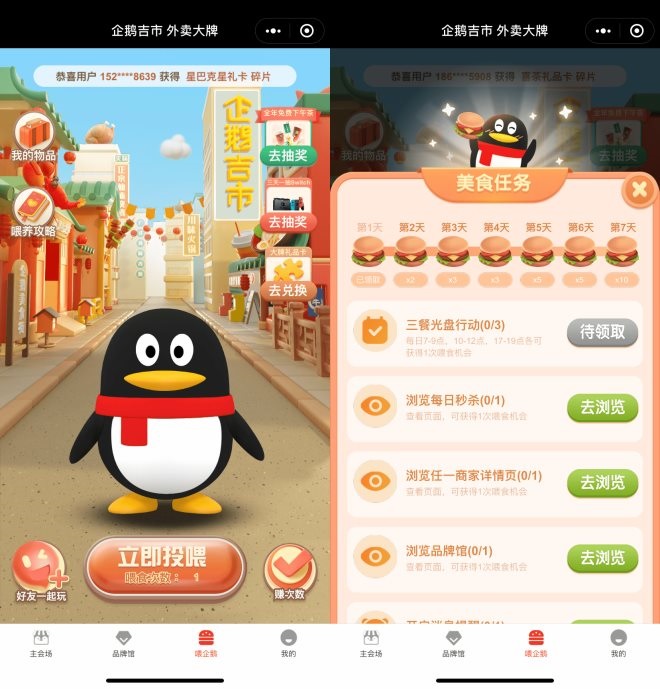 企鵝吉市自今年9月7日正式上線,攜麥當(dāng)勞、星巴克、真功夫、盛香亭等20多家餐飲品牌齊亮相,在小程序中提供每日秒殺、喂企鵝小游戲、獨(dú)家優(yōu)惠券等豐富玩法和福利。上線后,企鵝吉市很快與麥樂送共同推出首次“超級品牌周”。